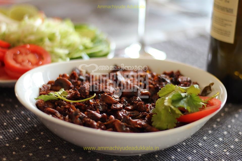 പൊടികച്ച് വെച്ച മസാല വഴറ്റിയ ചെരുവയിലേക്ക് ചേര്ത്ത് ഇളക്കുക , വീണ്ടും അതിലേക്ക് മുളക്പൊടി മഞ്ഞള്പ്പൊടി എന്നിവ ചേര്ത്ത് ഒന്ന് വഴറ്റിയ ശേഷം നീളത്തില് കനം കുറച്ചു അരിഞ്ഞ കൂണ് ഇട്ടു ഉപ്പും ചേര്ത്ത് നന്നായി ഇളക്കി വെള്ളം വറ്റുന്നതുവരെ ഫ്രൈ ആകി എടുക്കുക
