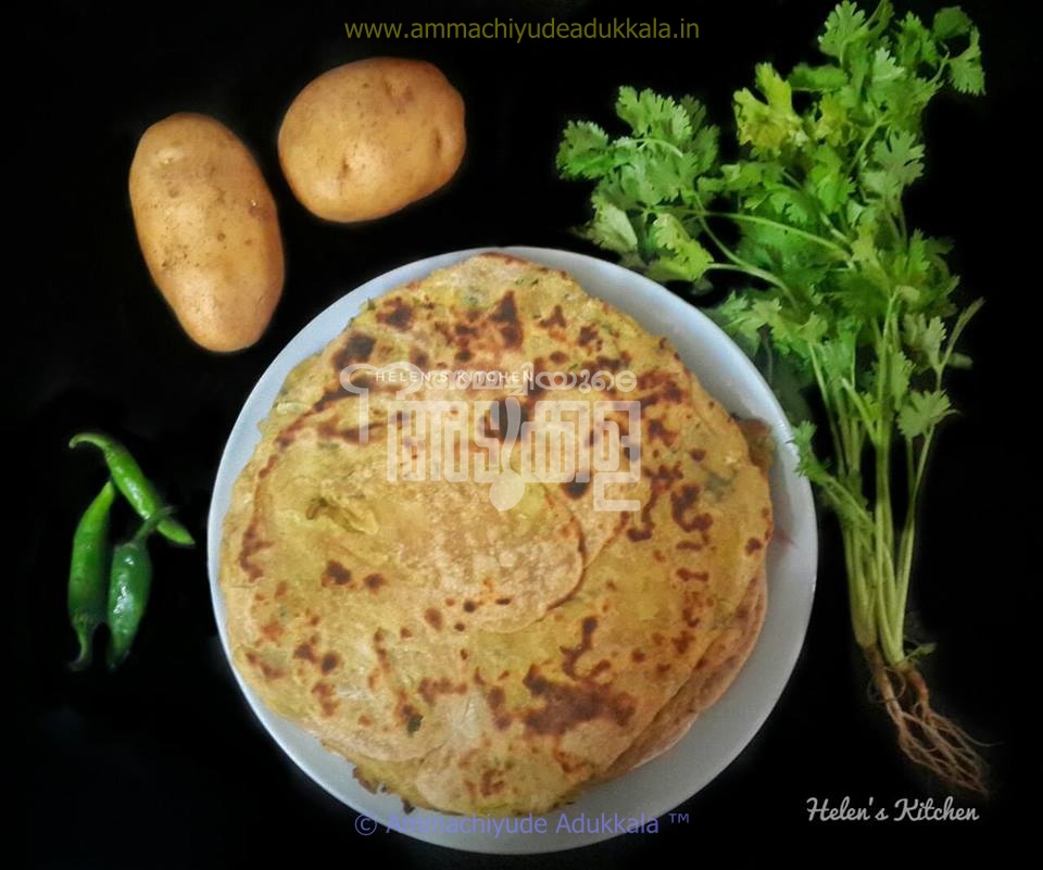 മാവ് ഒരു വലിയ ഉരുളയെടുത്ത് ചെറുതായൊന്ന് പരത്തുക. ഉരുളക്കിഴങ്ങ് Mix നടുക്ക് വച്ച് മാവ് Ball ആക്കി ,പലകയിൽ പൊടി വിതറി പരത്തുക . മസാല പുറത്ത് വരരുത്. കറച്ച് കട്ടിയിലായാലും കുഴപ്പമില്ല.